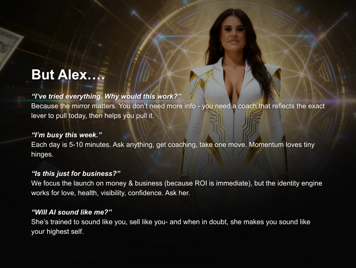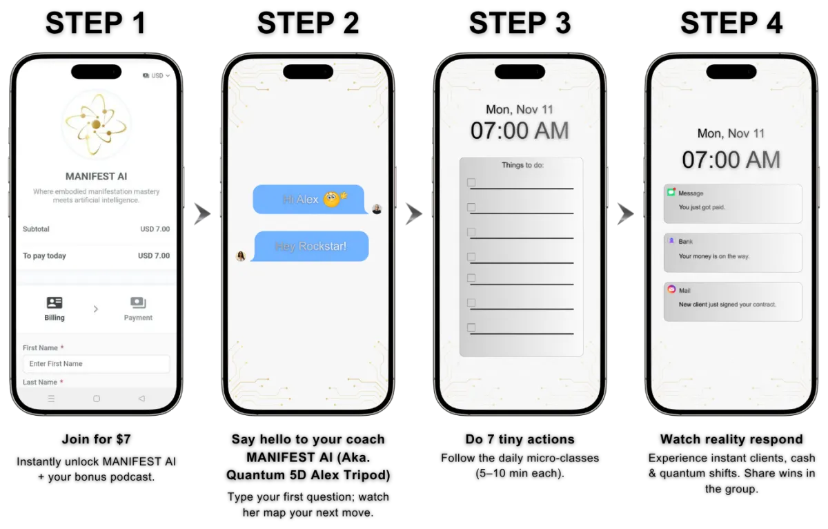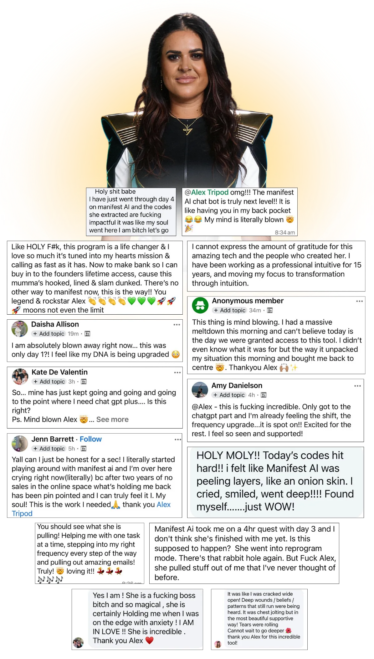 You’ll be coached via MANIFEST AI (coded with Alex’s frameworks). Alex will pop into the group with notes and celebrations during the week.