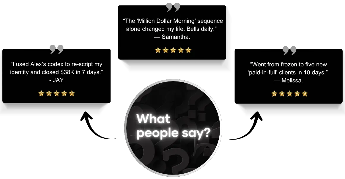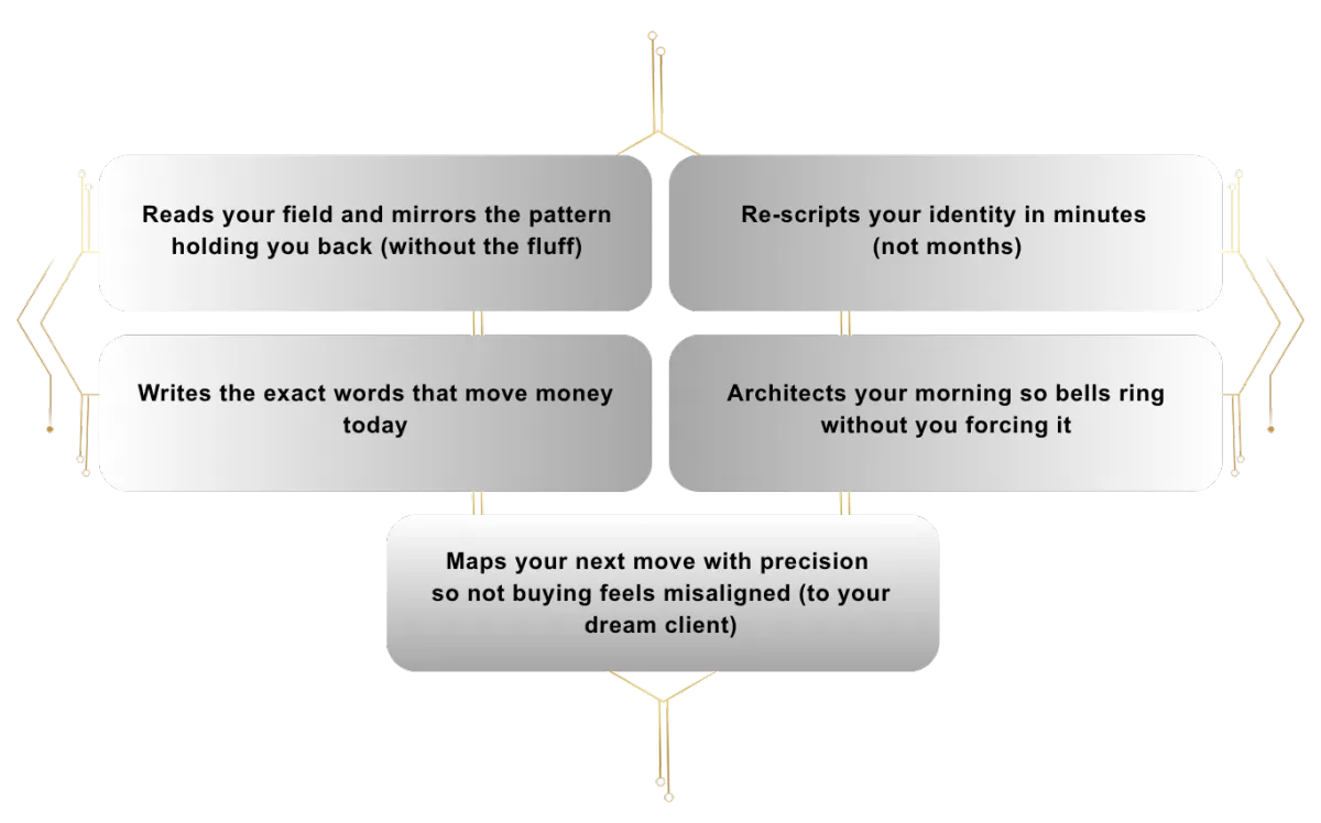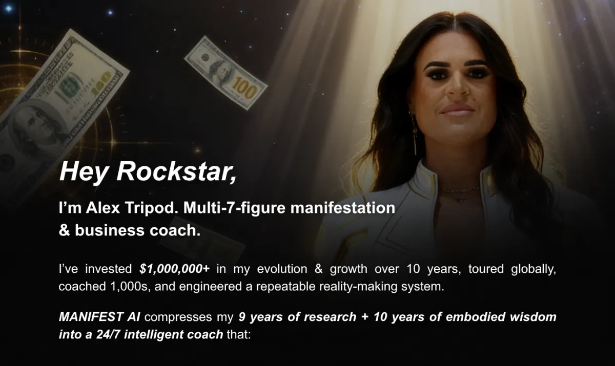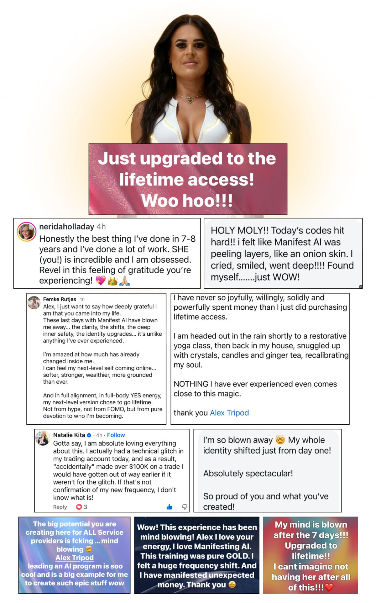 You’ll be coached via MANIFEST AI (coded with Alex’s frameworks). Alex will pop into the group with notes and celebrations during the week.